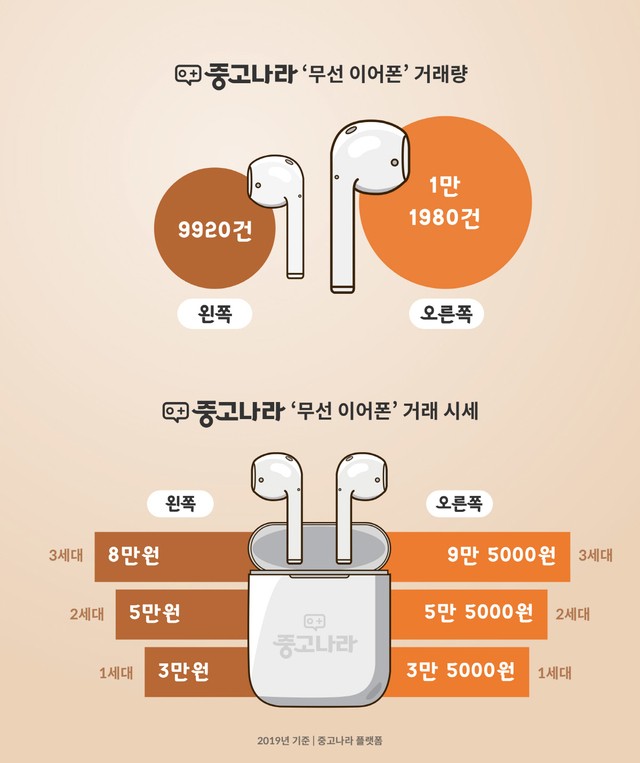 중고나라 2019년 에어팟 한 쪽 거래량을 분석한 결과 오른쪽 1만1980건, 왼쪽 9920건, 충전 케이스 8916건으로 집계되었습니다.