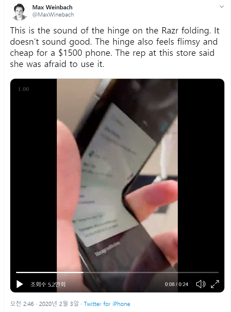 “This is the sound of the hinge on the Razr folding. It doesn’t sound good. The hinge also feels flimsy and cheap for a $1500 phone. The rep at this store said she was afraid to use it. https://t.co/dCXZNlCF0P”
